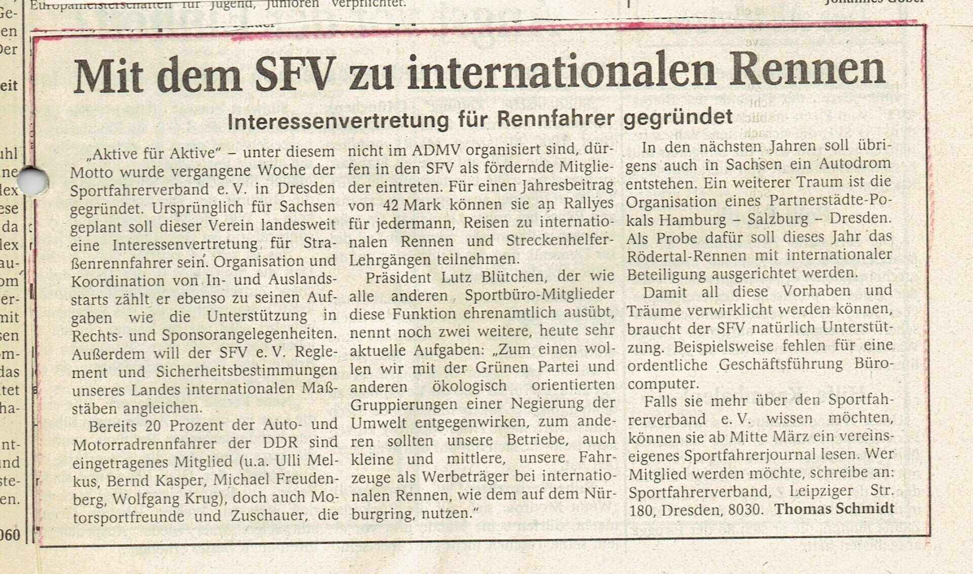Die Gründungsveranstaltung des Sportfahrerverbandes am 4. Februar 1990 im Klubhaus des Arzneimttelwerkes Radebeul, zu der 190 Personen erschienen waren, darunter 80 aktive Fahrer und viele DDR Meister aller Klassen, wurde zur Grundlage einer neuen motorsportlichen Ausrichtung in der Noch-DDR.