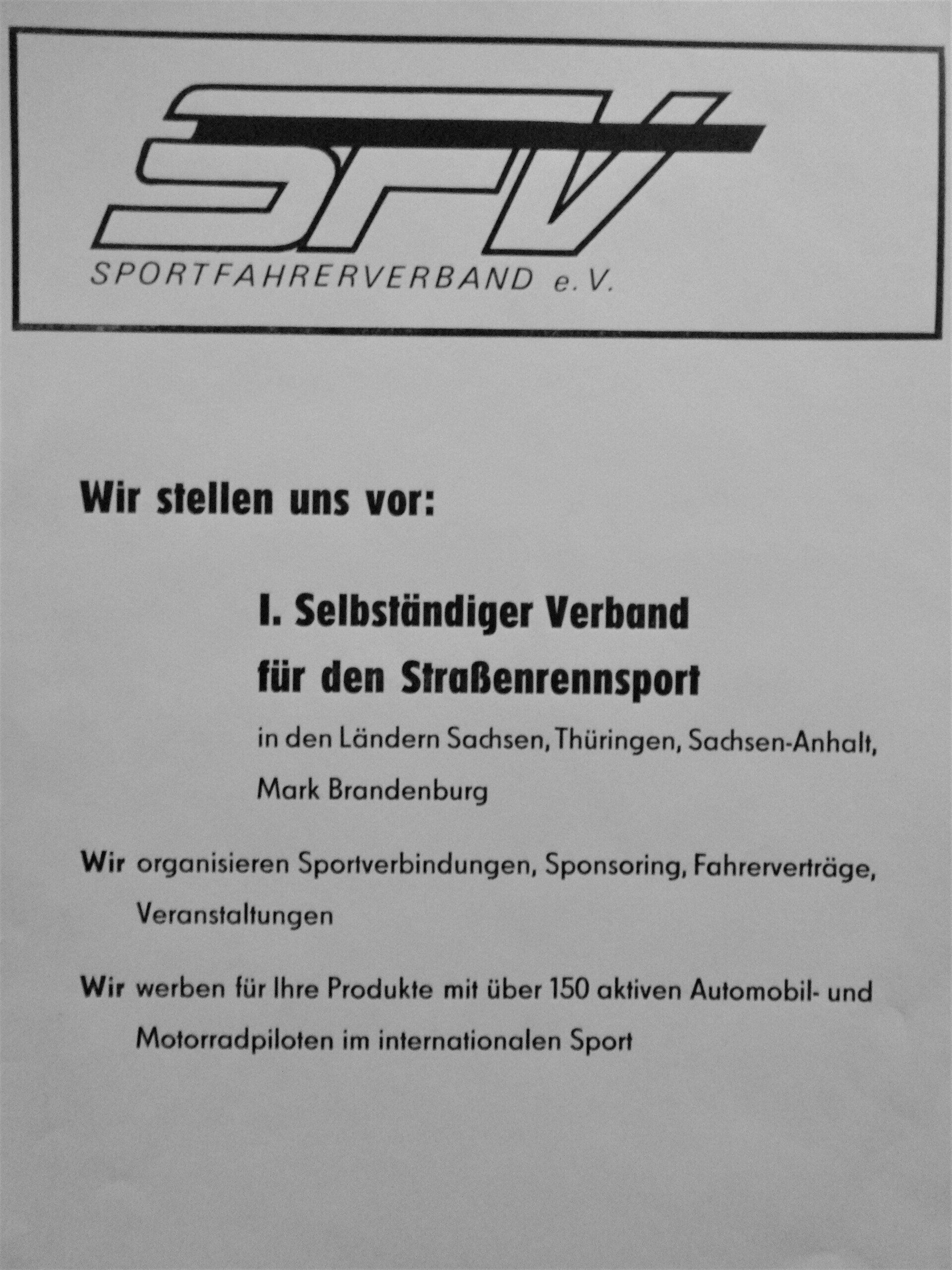 Als nach längerem Hin und Her klar war, das aus Berlin nichts anderes zu erwarten war als Spott und Häme über unseren "Rennschrott" , entschlossen sich Sportfreunde aus der Rödertal-Rennleitung Eigeninitiative zu entwickeln. Es kam zur Gründung einer regime-unabhängigen Fahrervereinigung, dem Sportfahrerverband e.V. mit dem die Interessen der Fahrer im Einigungsprozess vertreten werden sollten.